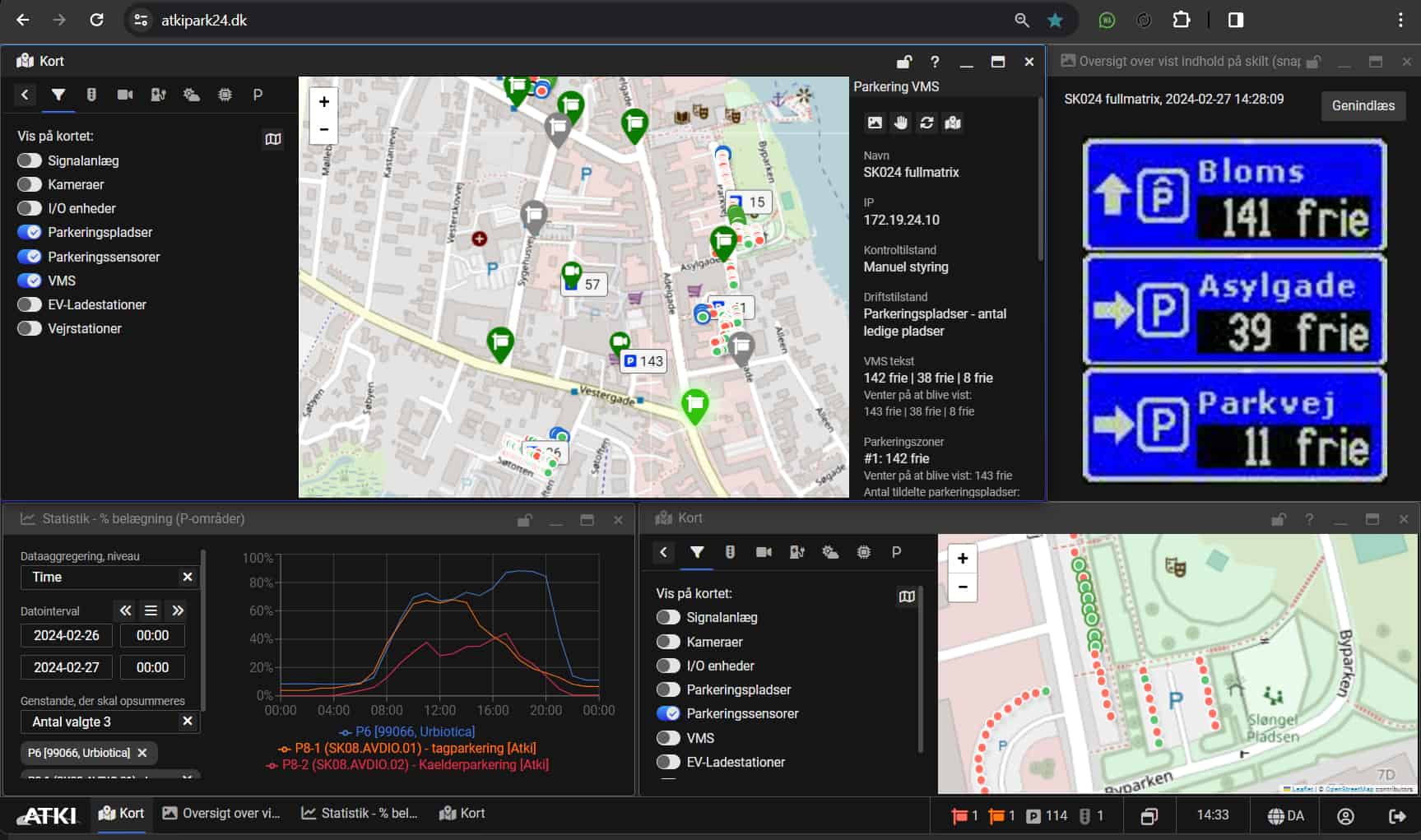 I ATKIpark24.dk har man mulighed for at overvåge og fjernstyre de forskellige p-vejvisningstavler (VMS) samt detektorer og opnå dybere dataindsigt i forhold til anvendelse, brugsmønstre osv. Det interaktive kort (vist i midten på billedet) giver et intuitivt her-og-nu overbliksbillede, hvor placeringen af de respektive tavler, p-pladser, sensorer mv. tydeligt fremgår. Et klik på en af tavlerne giver en række stamdata samt et live-billede af tavlens nuværende visning. Full-matrix tavlerne giver desuden operatøren mulighed for dynamisk at ændre visningen, så der i stedet for antal ledige p-pladser skiltes med et brugerdefineret budskab.