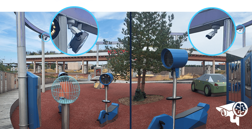 Oplevelsesområdet oplyses af vartegnet for ”Jagten på den gode energi” – en stor ”glorie”, der lyser i farver i takt med, at der samles ‘energipoint’ i oplevelserne, og – som I kan se på billederne herunder – er det på undersiden af denne glorie, at ATKIs tekniker har placeret de to AI-kameraer, der er primus motor i tællemaskineriet.